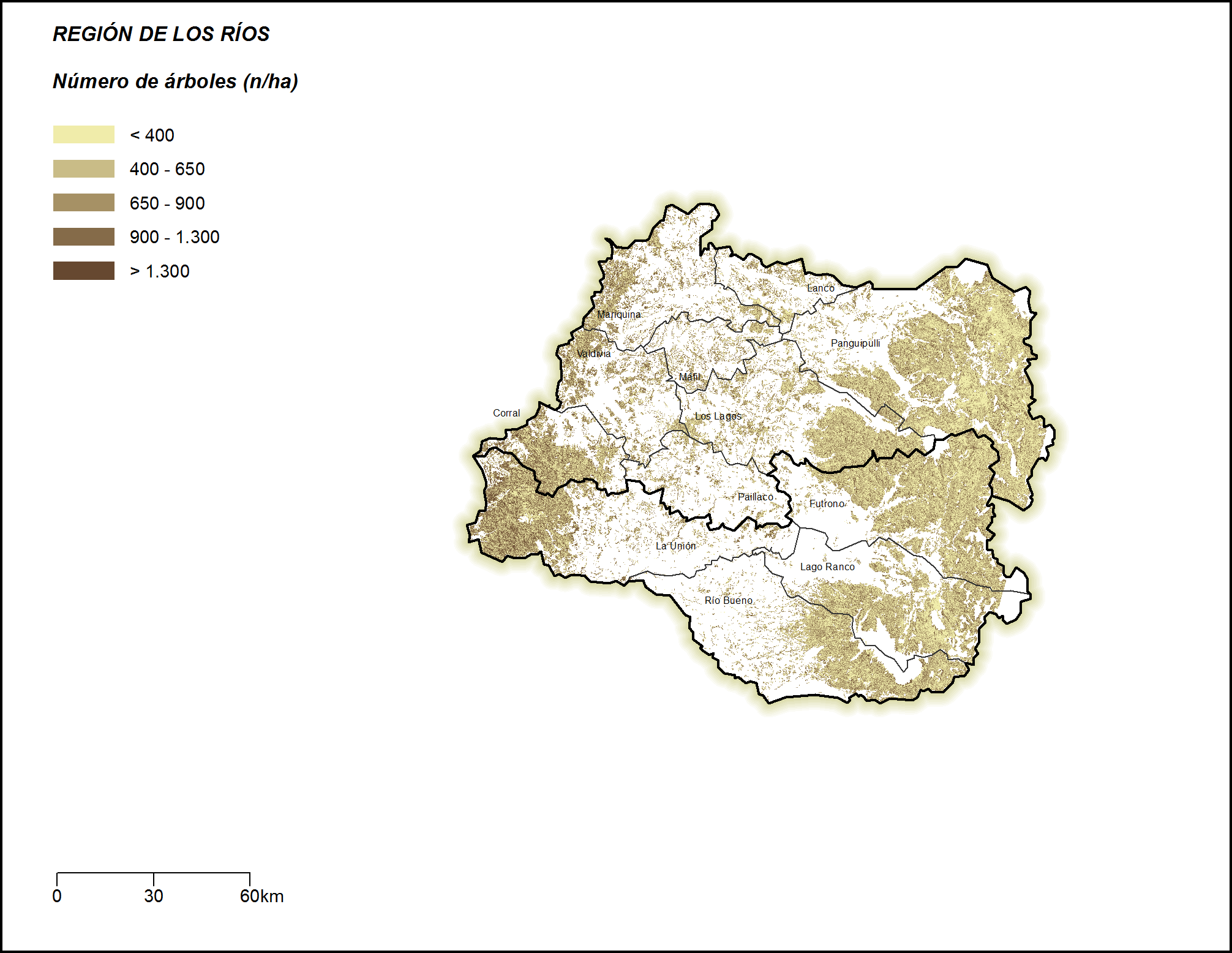 Mapa temático de Número de Arboles por Hectárea de la Región de Los Ríos