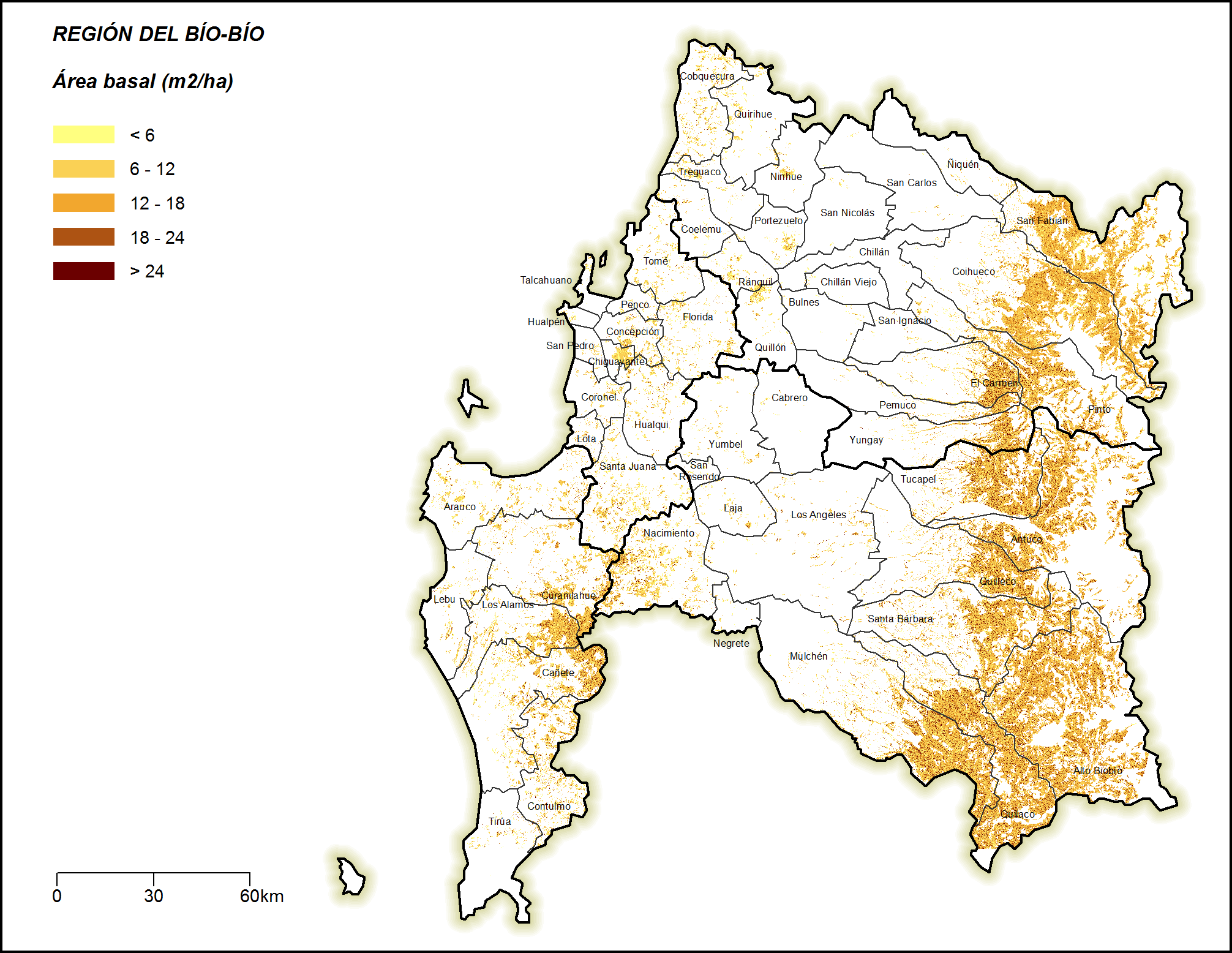 Mapa temático de Área Basal de Bosque Nativo de la Región del Biobío.