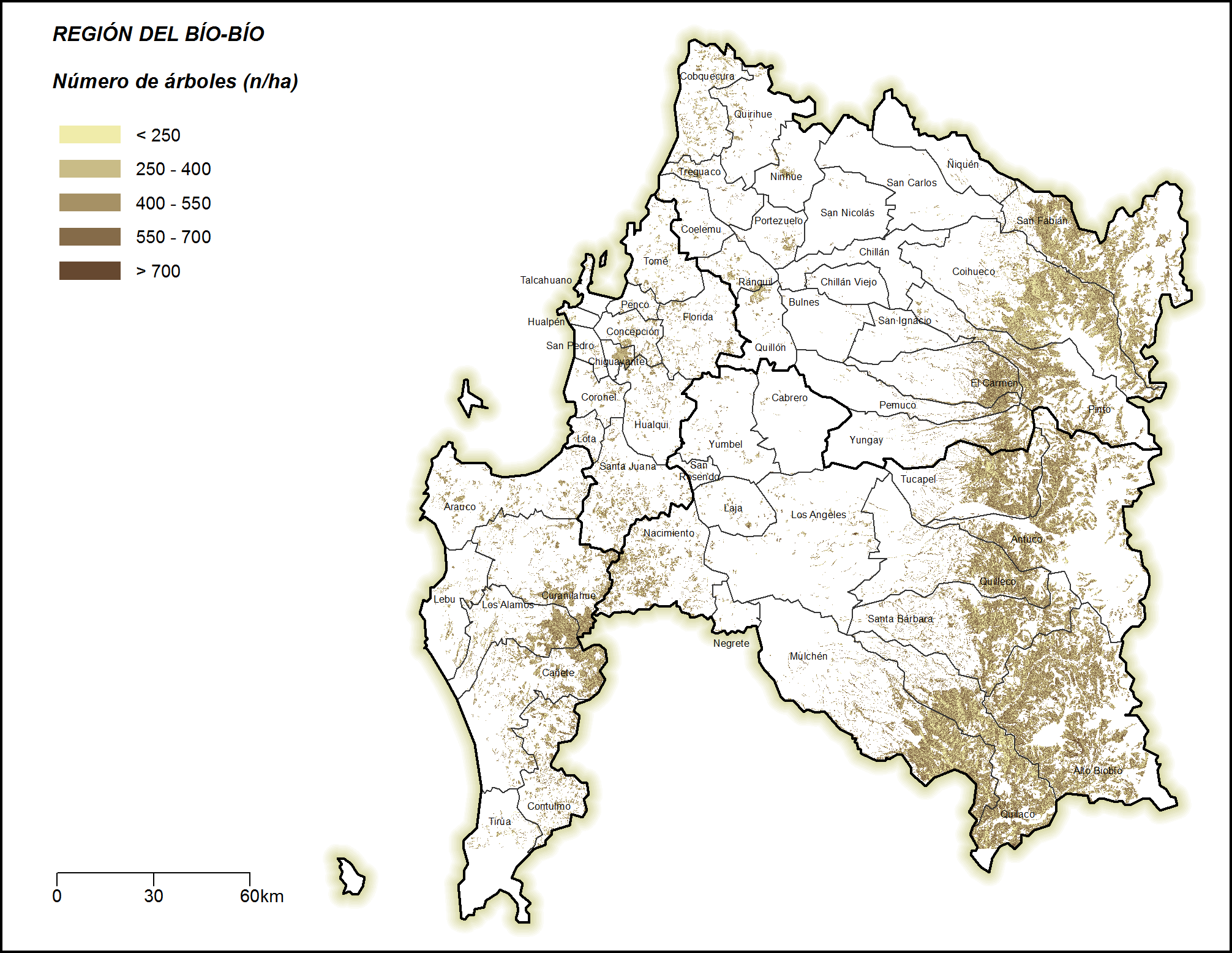 Mapa temático de Número de Arboles por Hectáreas de Bosque Nativo en la Región del Biobío.