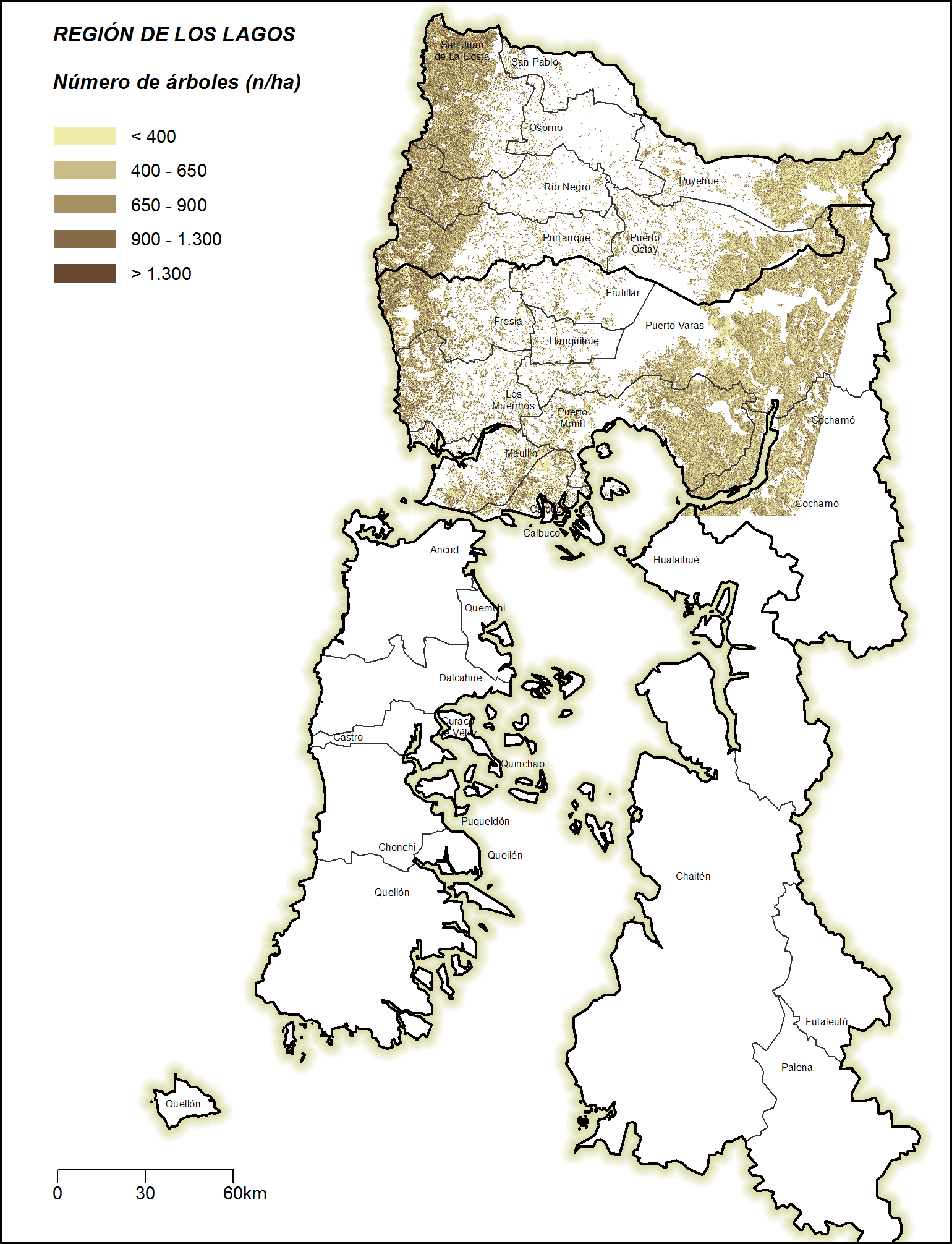Mapa temático de Número de Arboles por Hectáreas de Bosque Nativo en la Región de Los Lagos.